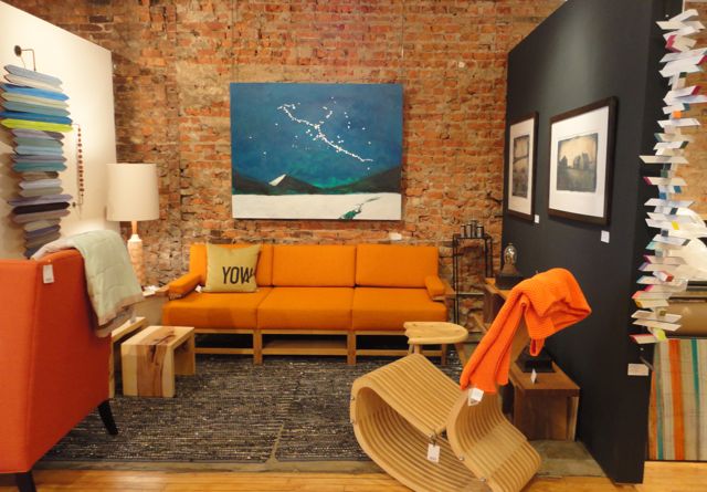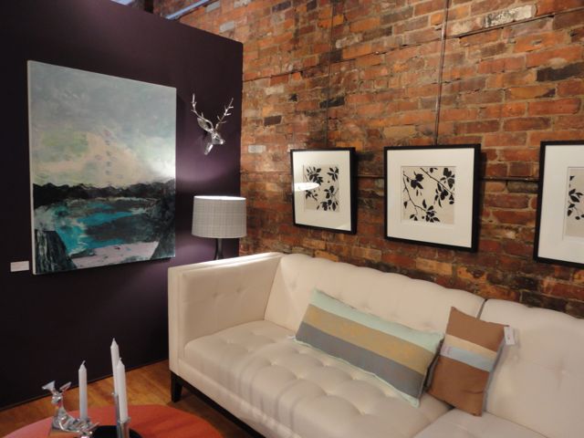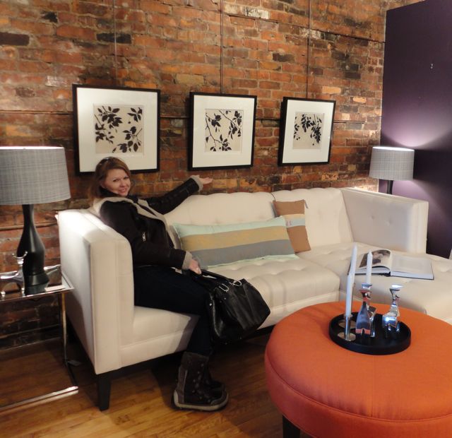 Wendy posing on a lovely couch under my artwork in Hamilton at the AGH Design Annex. Lots of fun shopping in Hamilton. Can’t really talk about it until after Christmas but James St. North has lots of fun gift shopping stores.A beautiful painting by Pearl VanGeest right next to mine.I loved everything in this room. The orange couch with Pearl’s blue sky painting above is so perfect.