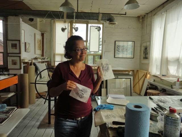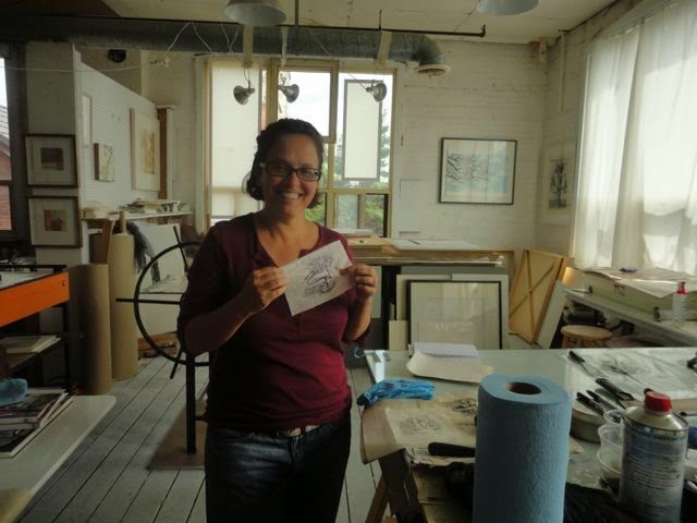 I received a telephone call the other day from a printmaker visiting Toronto who was interested in visiting my studio. I said, ‘sure we can have some lunch and chat print’. My visitor turned out to be the very talented Silvia E. Martinez, founder of Prima Ink printmaking centre in Tromso, Norway. We ate and chatted print talk, like I haven’t chatted print in some time. It was really good. Our conversation veered towards environmentally friendly and responsible printmaking practices, which we are both interested in and Prima Ink is strongly focussed on. From our earth friendly print chat we got onto Pronto plate printmaking and water soluble etching inks. Silvia was very curious about this Pronto plate thing, so I showed her the basics and she tried one for herself. She was quite pleased with the simplicity of preparing the plate as well as the ease of printing it. Here is some info from Kevin Haas about Pronto plate and how to work it. There are also some very helpful videos on youtube that can supply you with all kinds of short cuts and tips to make your first go successful.