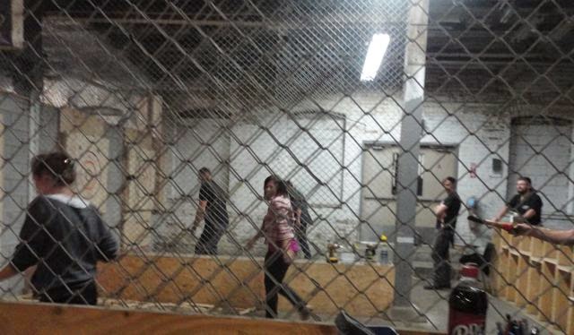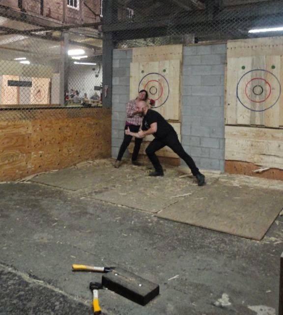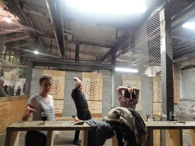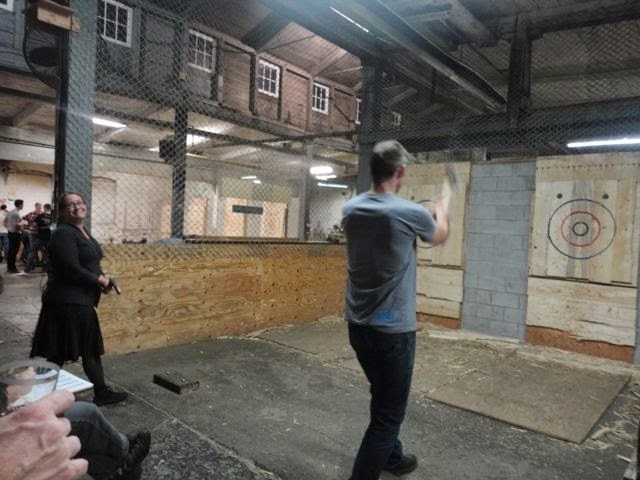 After all of the in the round II excitement, Chris and I hustled over to the East end where we were invited to join in a friend’s birthday party- axe throwing.