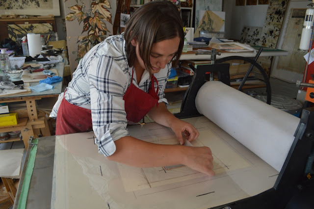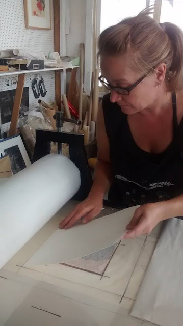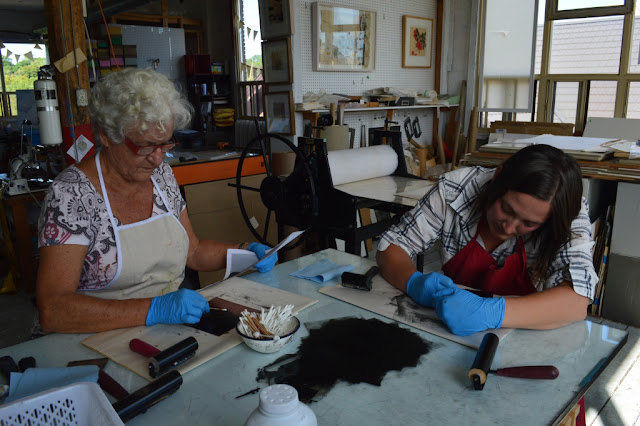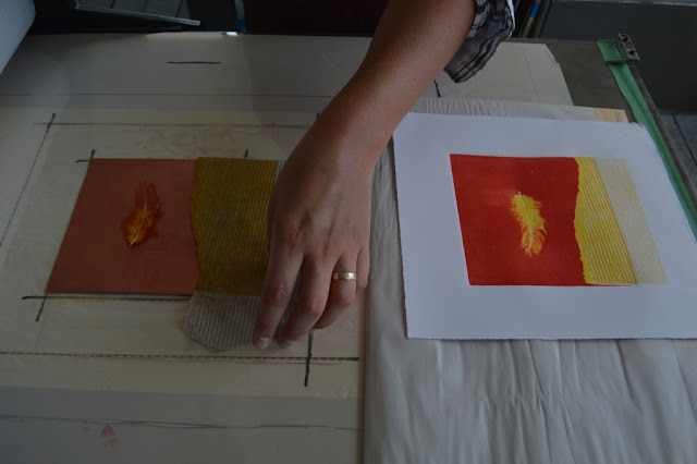 I have been promising Heidi Berger and Becky Comber a short monoprinting how-to, when the three of our schedules allowed. Luckily we found some time last week to get started. I think they both enjoyed themselves with the new techniques and we stayed later than planned. I think we will have to do some follow up sessions soon.