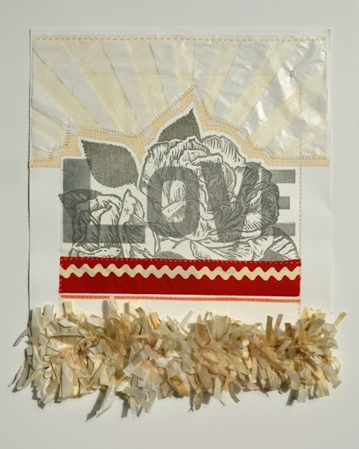 This is my ‘love rays’ mixed print and washi piece with hand stitching. There are five works like this in the show. I am really enjoying pushing my print work on fine washi in more of a textile direction. Actually I am not sure what direction it is yet but I really like sewing all the printed pieces of washi together better than pasting right now.