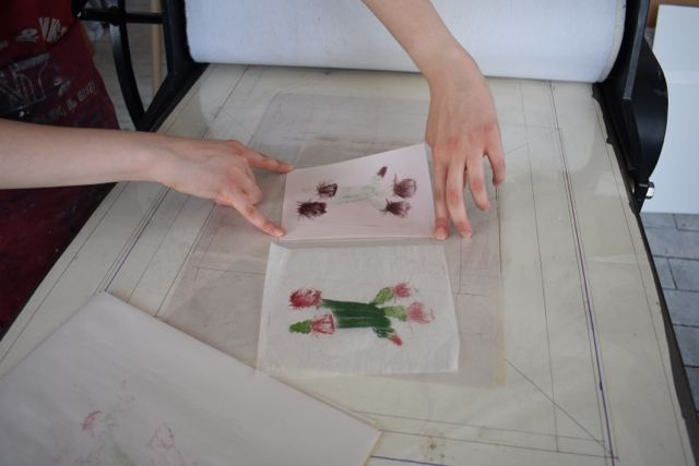 We were not sure if we were going to meet this day or not as Heather would only be able to come if she passed her drivers test the day before. She was successful with her test but did get a bit misdirected when she found herself heading for the highway by habit and had to turn around and get on the country roads. She arrives completely unfazed and dives into printing, completing the next three colours of the print, with an edition of 12. (I am in awe here as I remember my first drive alone with my new license, it wasn’t far and I was frazzled.)