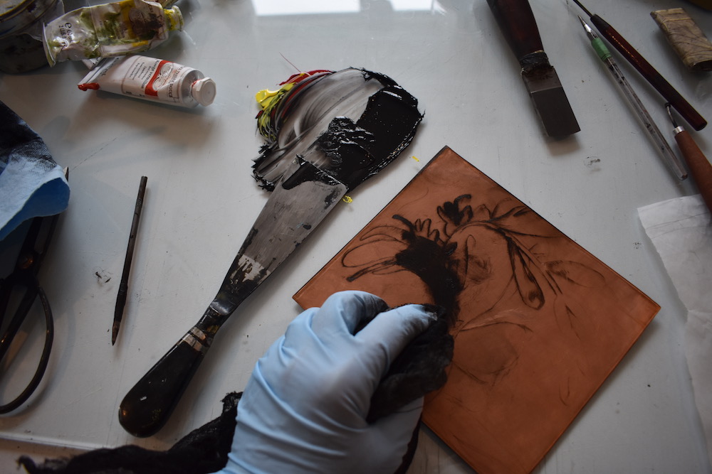 Intaglio can be simply described as drawing or etching into a metal plate (in my case, copper) to create grooves and depressions which hold the printing ink. This ink is then transferred onto the paper through the pressure of an etching press. The etched lines in the plate allow for the process to be repeated until the plate’s surface has worn down to the point that its ability to hold ink has been affected.